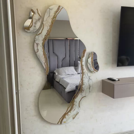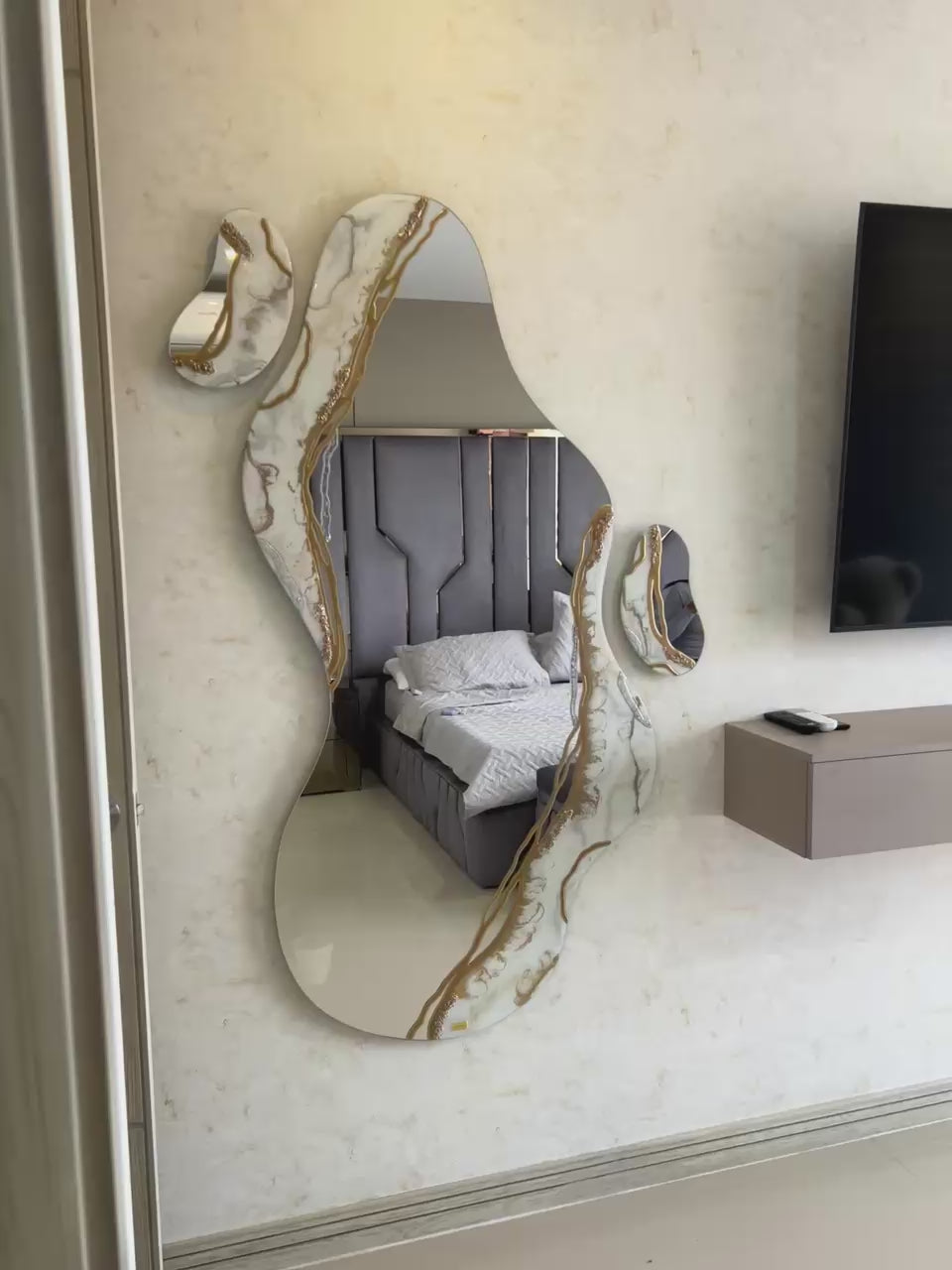 Espejo decorativo de forma orgánica con detalles en mármol blanco y vetas doradas