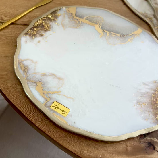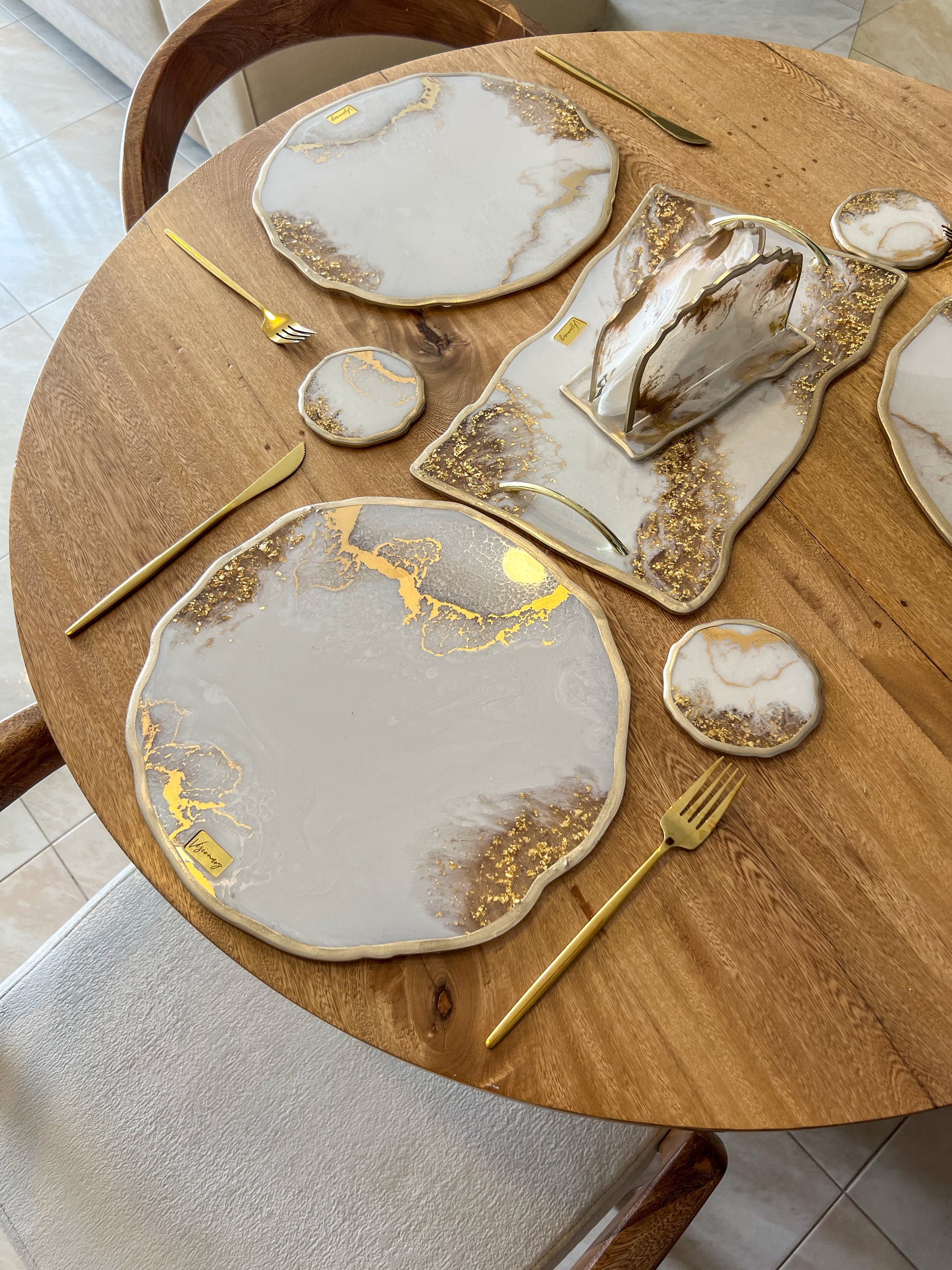 Déjate envolver por la delicadeza de Golden Haze, un set de mesa hecho a mano que combina tonos blanco suave, beige natural y detalles dorados como polvo de luz. Sus formas orgánicas y texturas sutiles evocan la calma del diseño artesanal y el lujo atemporal.