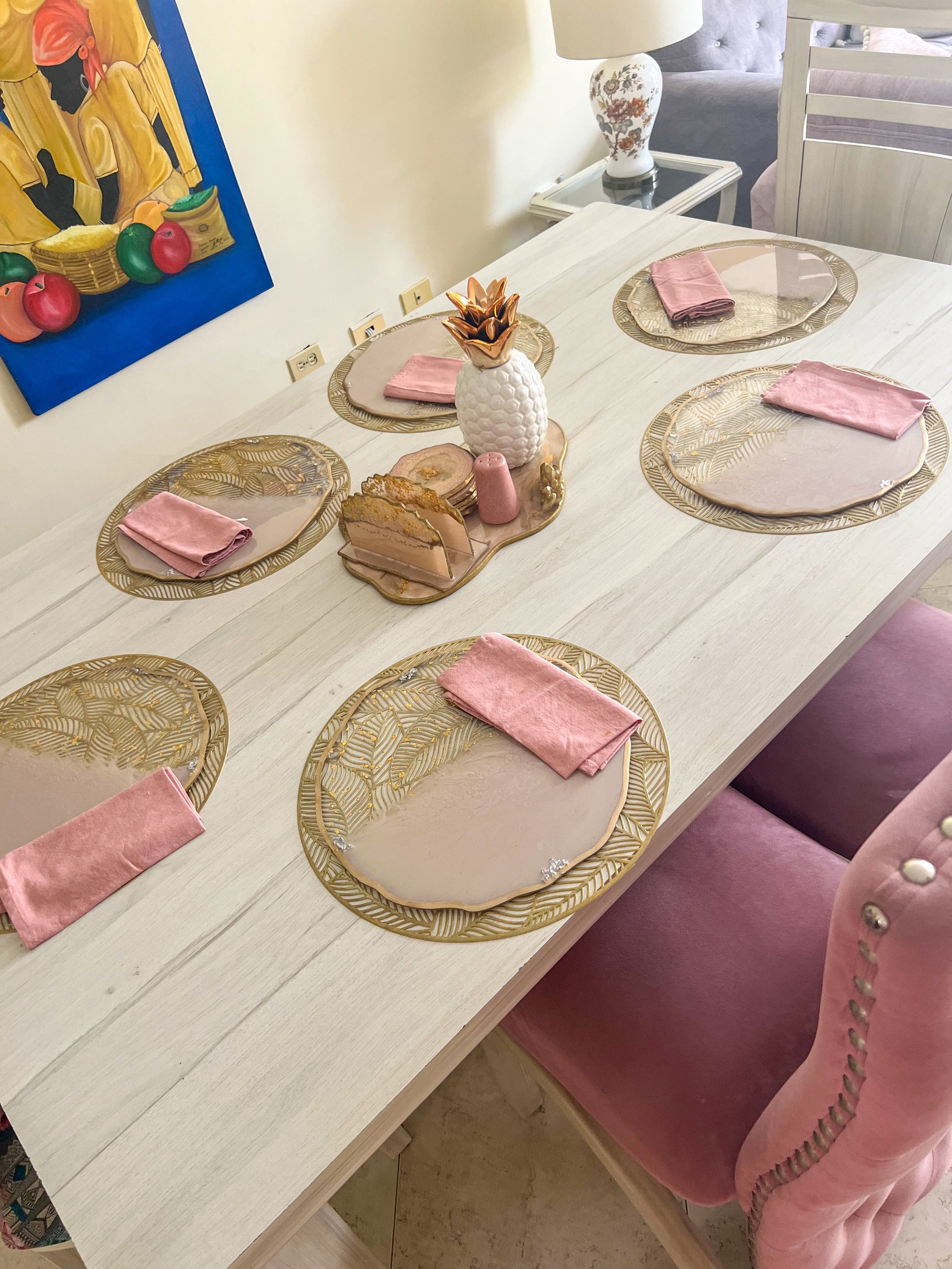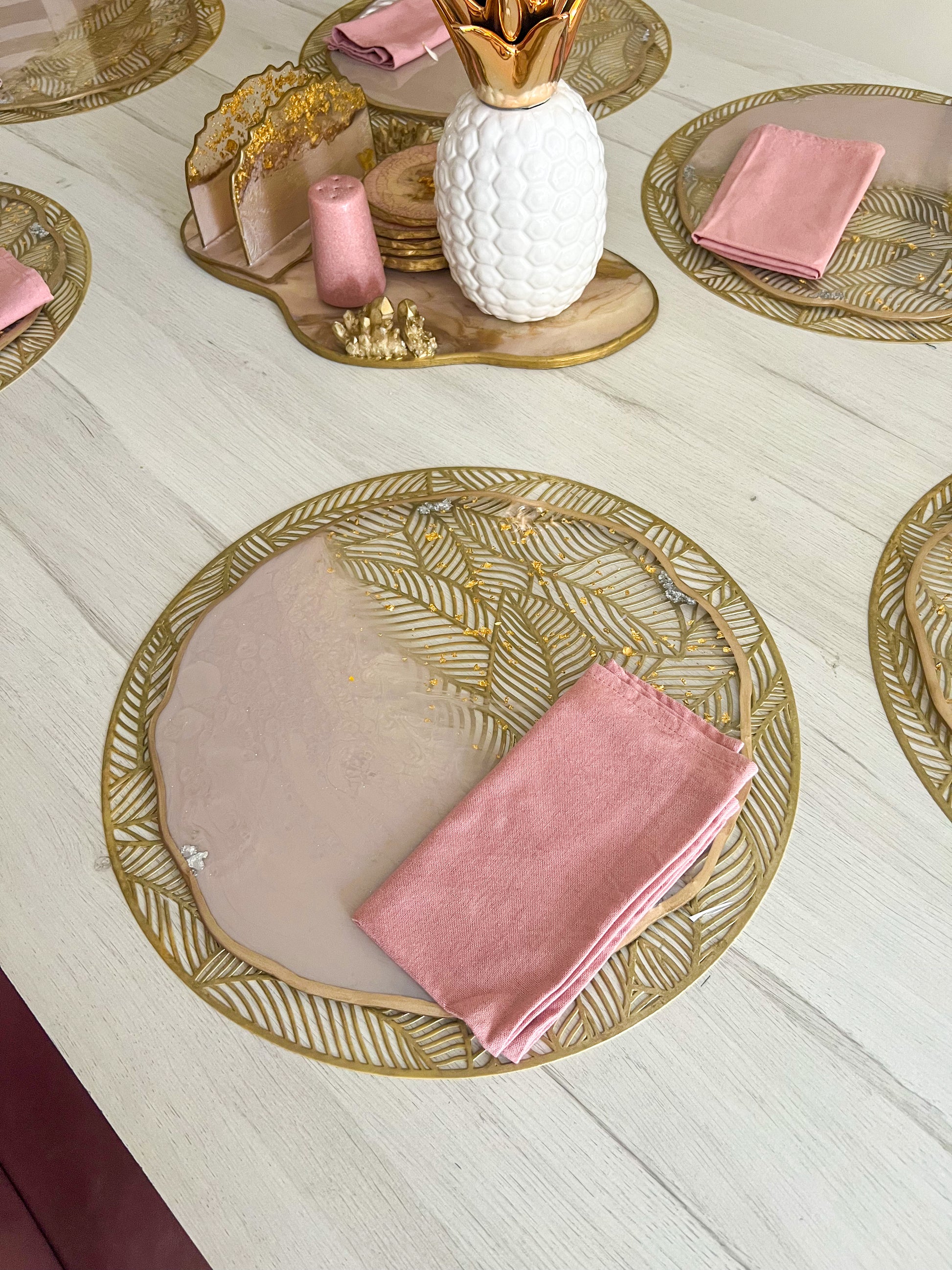 Romanticismo y lujo se unen en Golden Rose, una pieza que combina suaves tonos rosados con destellos dorados, evocando la calidez de un atardecer sobre pétalos de rosa. Hecho a mano con dedicación, este set transforma tu mesa en un espacio lleno de encanto, arte y dulzura sofisticada.