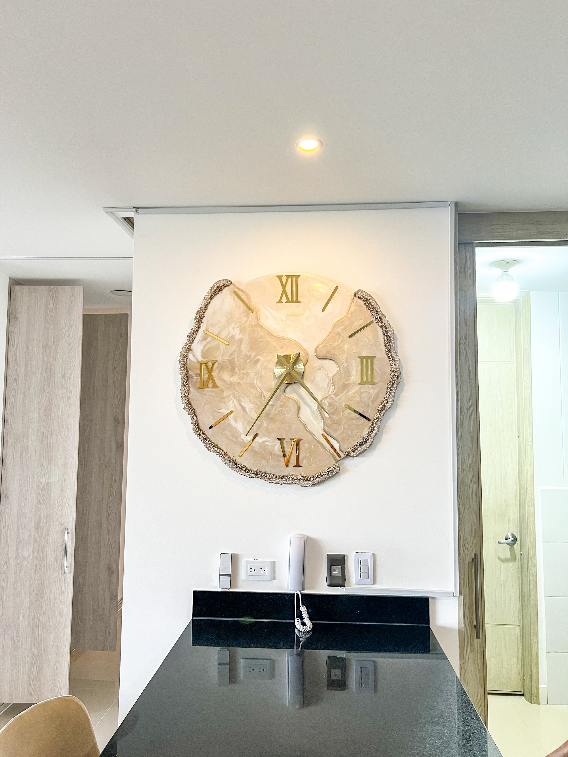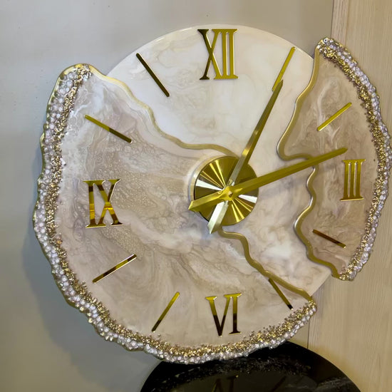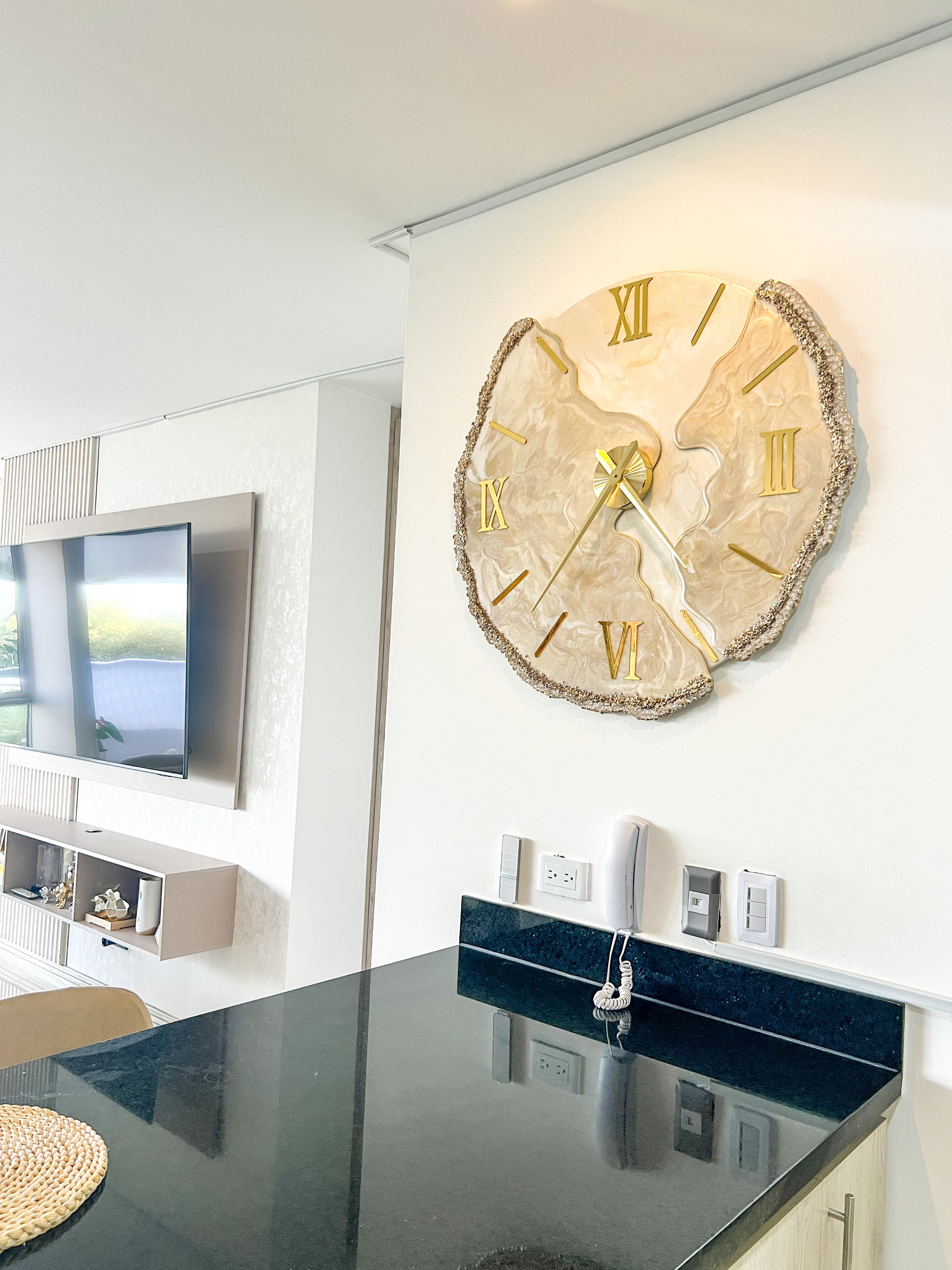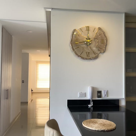 Lunar Desert es una pieza que captura la esencia de un desierto iluminado por la luna. Sus tonos cálidos en beige, dorado y marfil se funden en un diseño orgánico que fluye como las dunas con el viento. Los bordes decorados con cristales brillan como granos de arena bajo la luz nocturna, haciendo de este reloj una joya decorativa que marca el tiempo con elegancia.