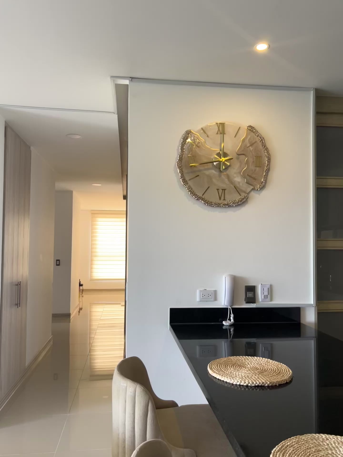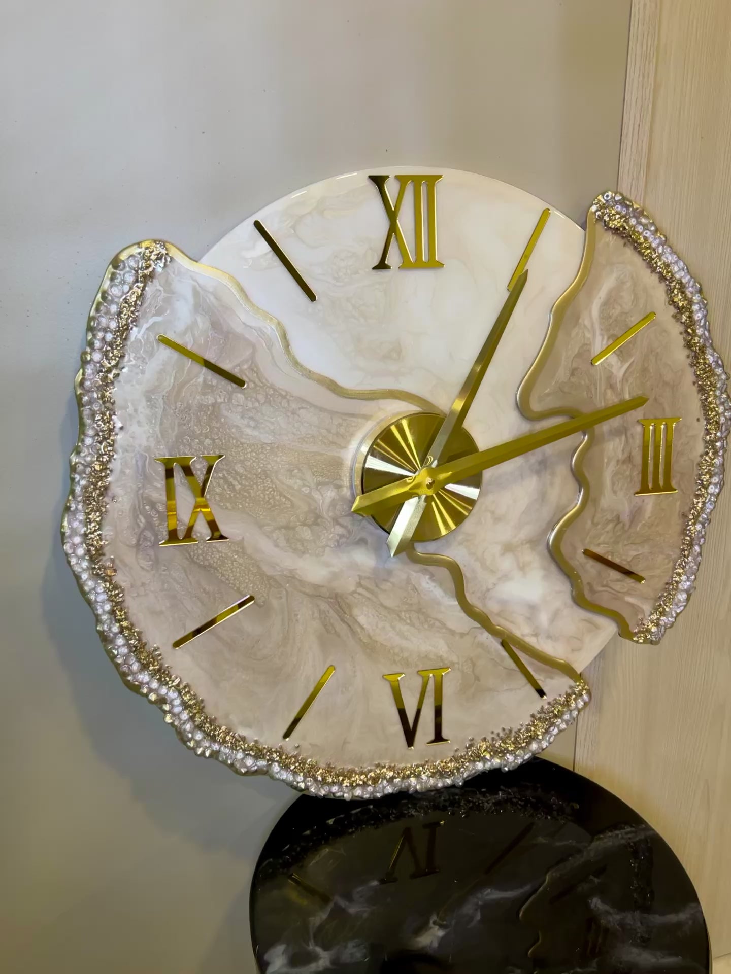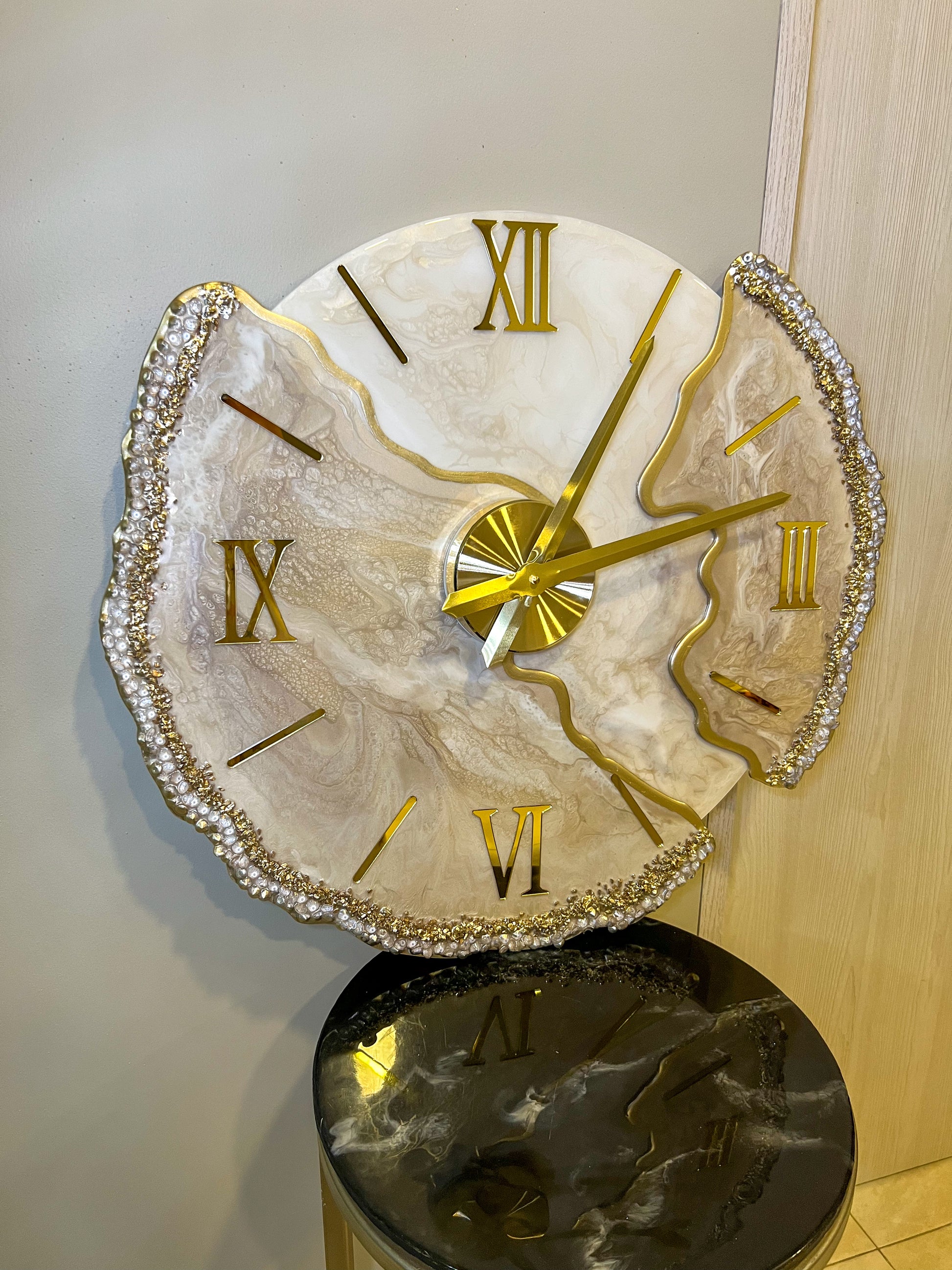 Lunar Desert es una pieza que captura la esencia de un desierto iluminado por la luna. Sus tonos cálidos en beige, dorado y marfil se funden en un diseño orgánico que fluye como las dunas con el viento. Los bordes decorados con cristales brillan como granos de arena bajo la luz nocturna, haciendo de este reloj una joya decorativa que marca el tiempo con elegancia.