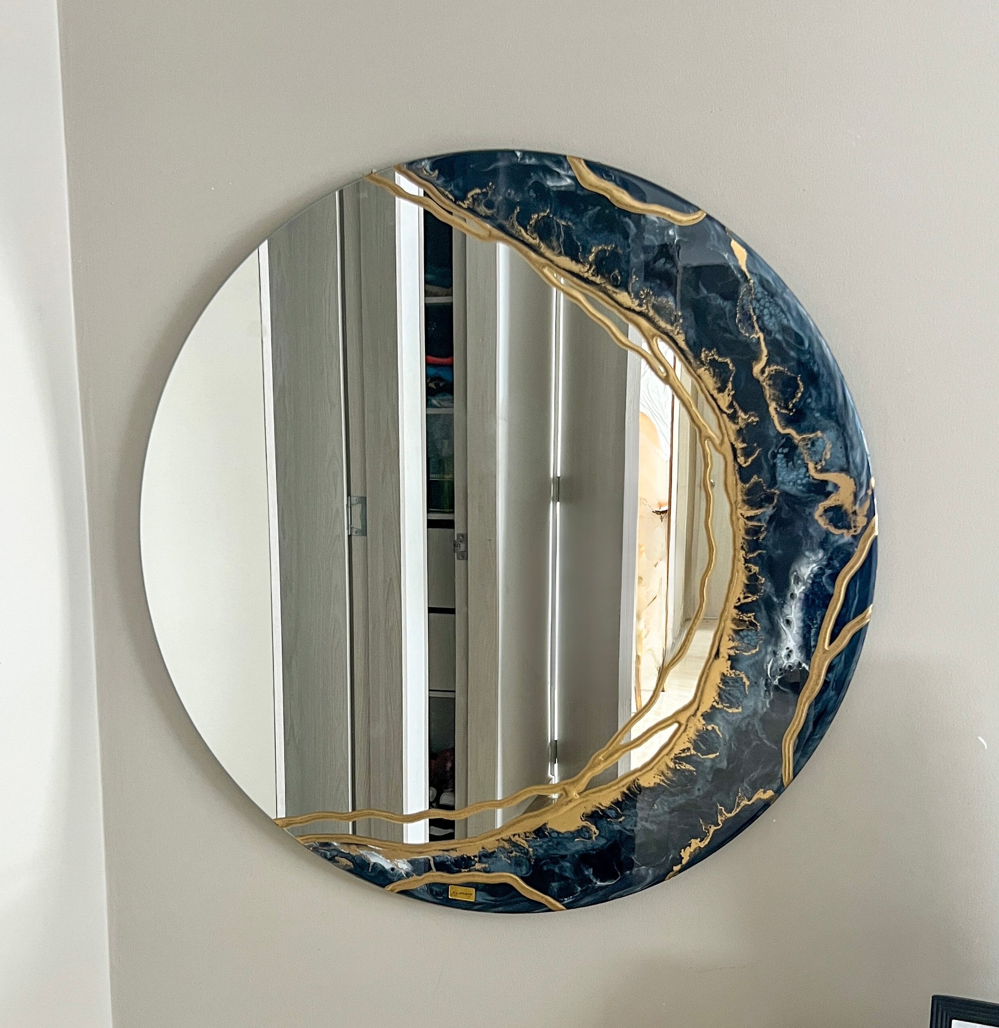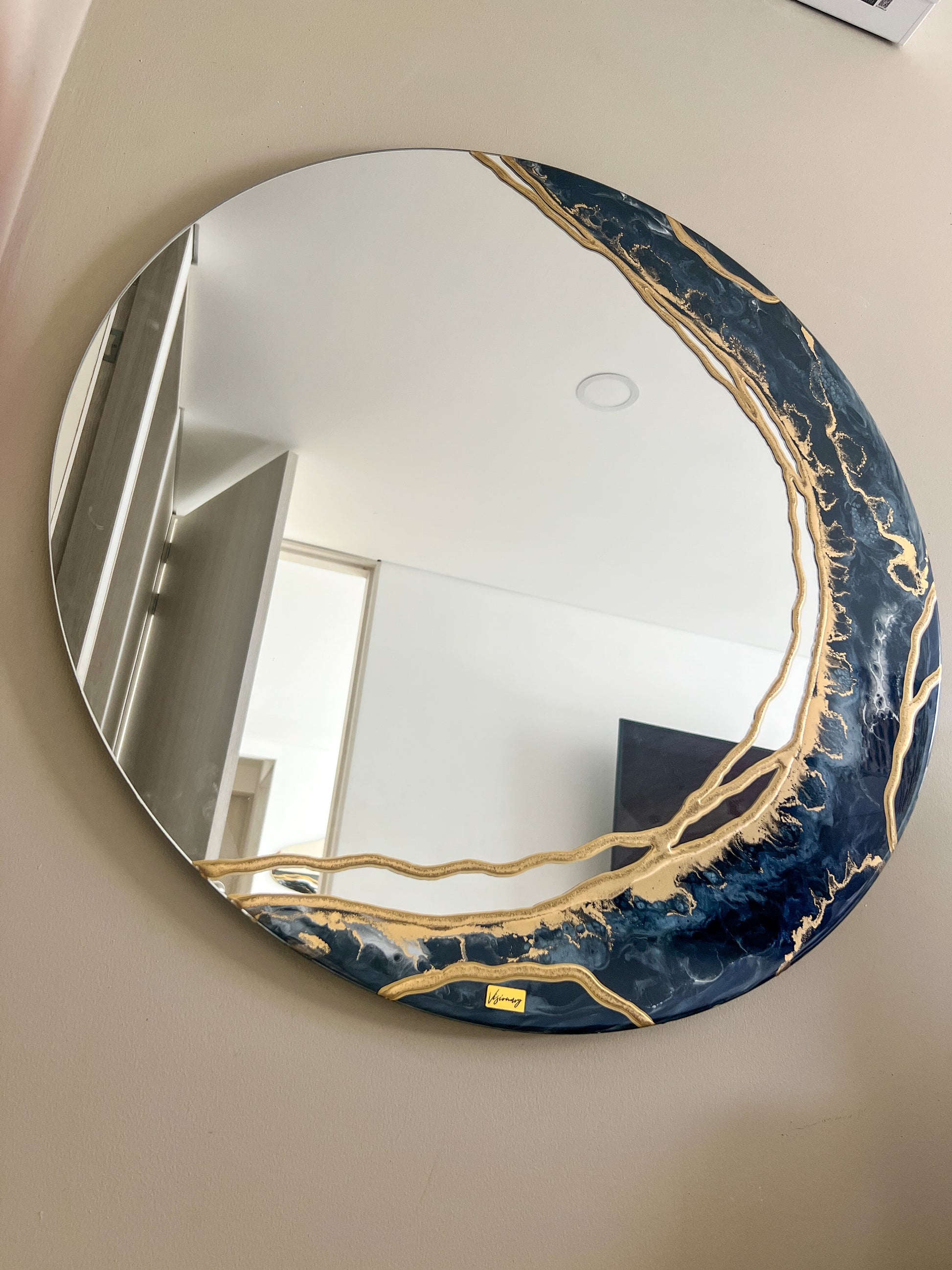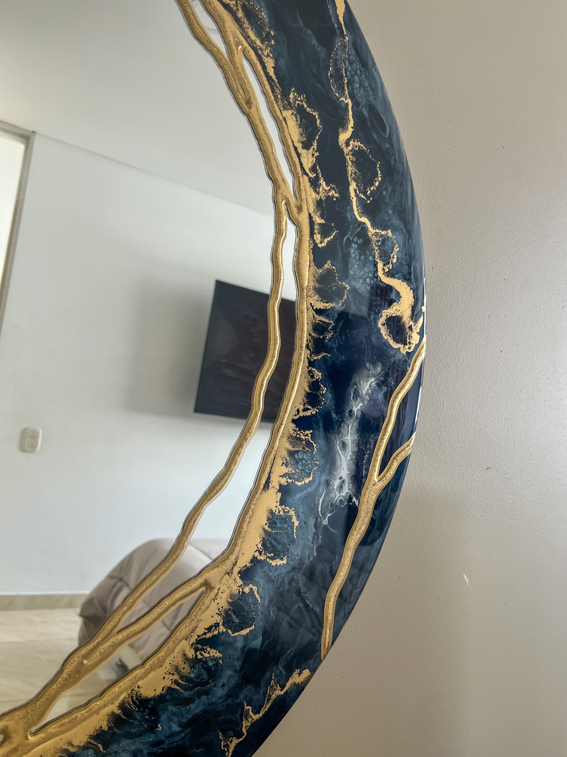 El espejo lunar Ocean Snow fusiona la magia del océano con la pureza de un paisaje invernal. Su contorno orgánico y acabado en tonos azul profundo, blanco espumado y suaves toques nacarados recuerda a olas tranquilas bajo la luz de la luna. Cada pieza está elaborada a mano, haciendo de este espejo una joya única para quienes buscan armonía, frescura y lujo natural en su decoración.