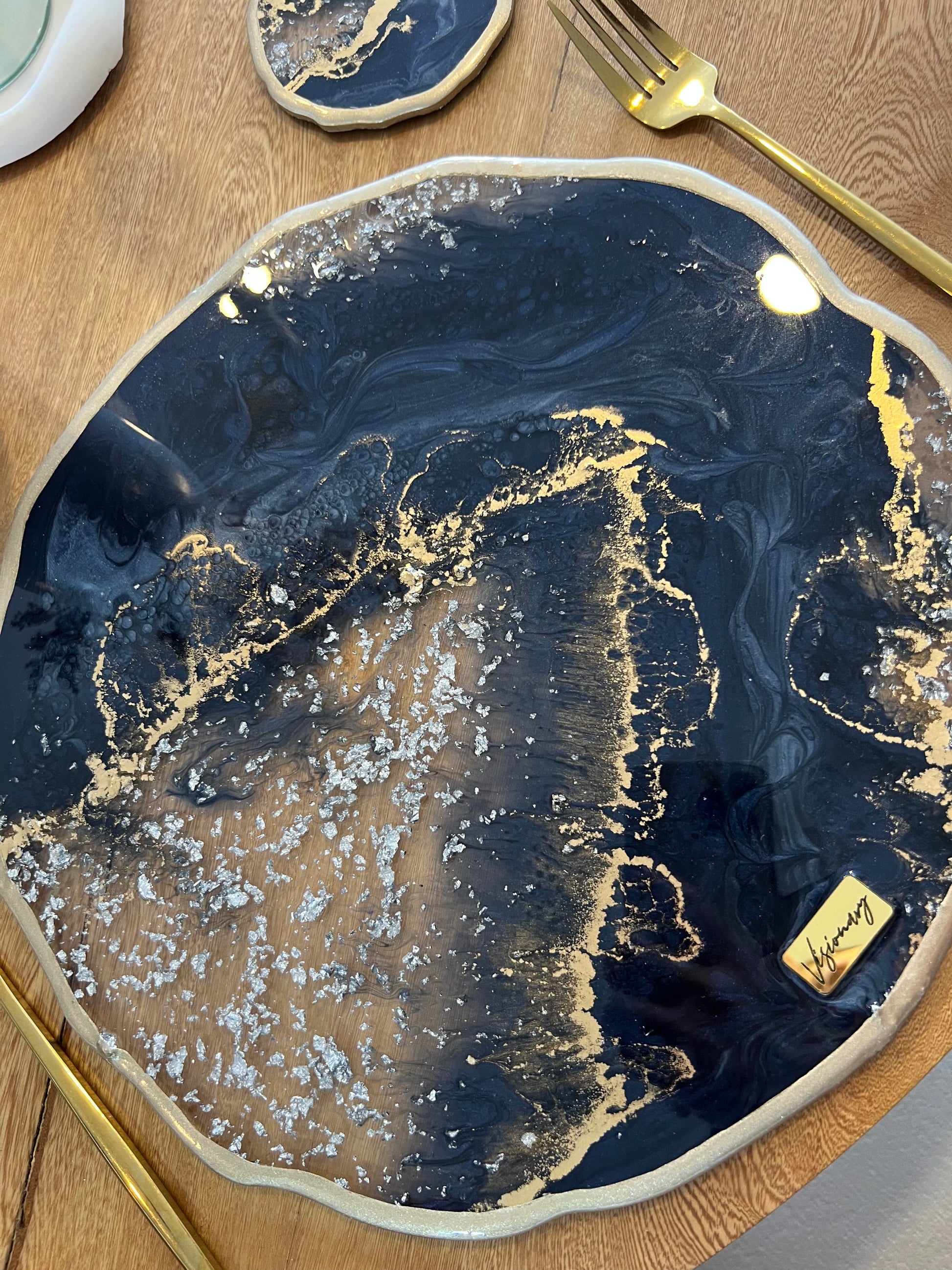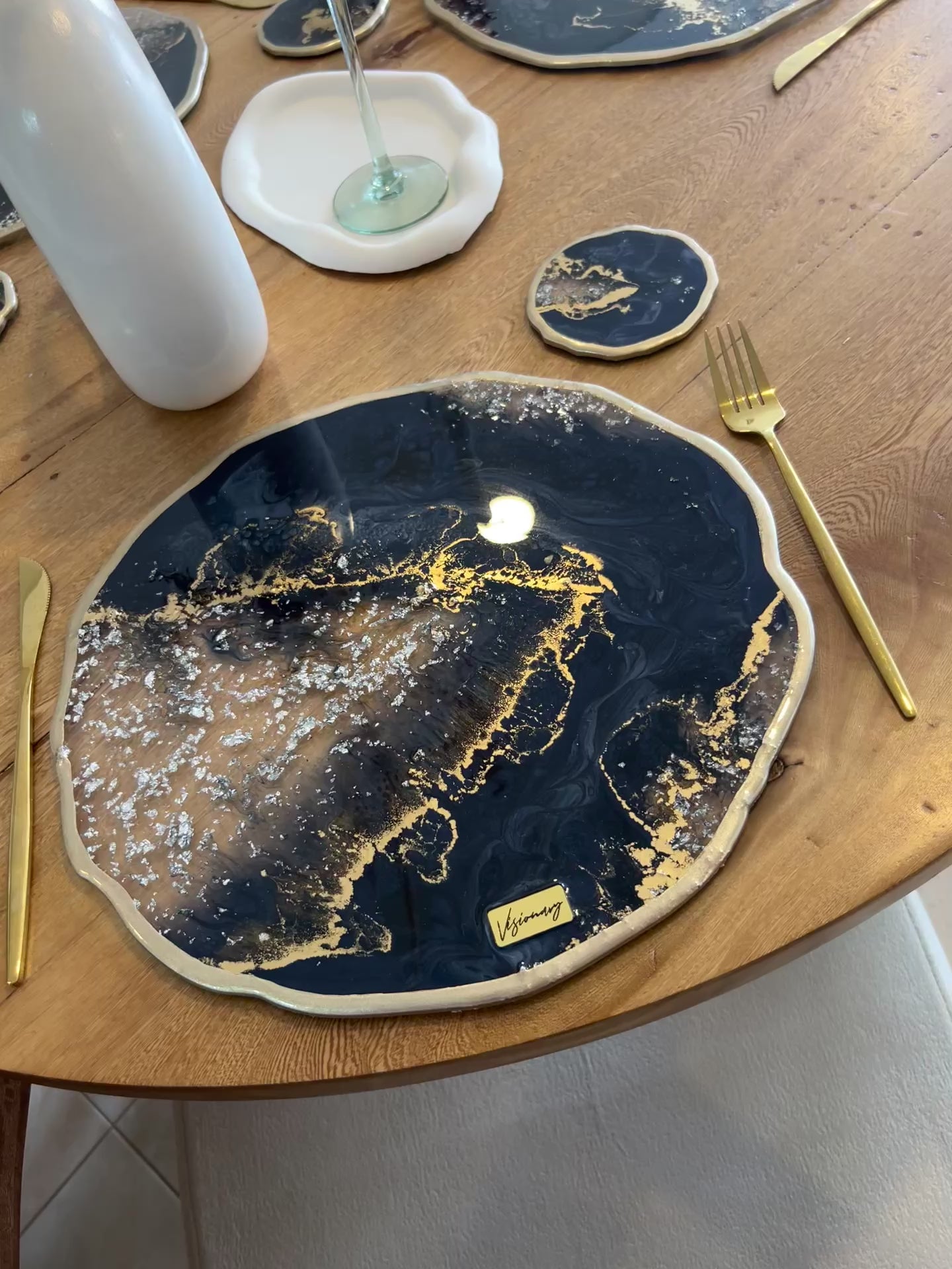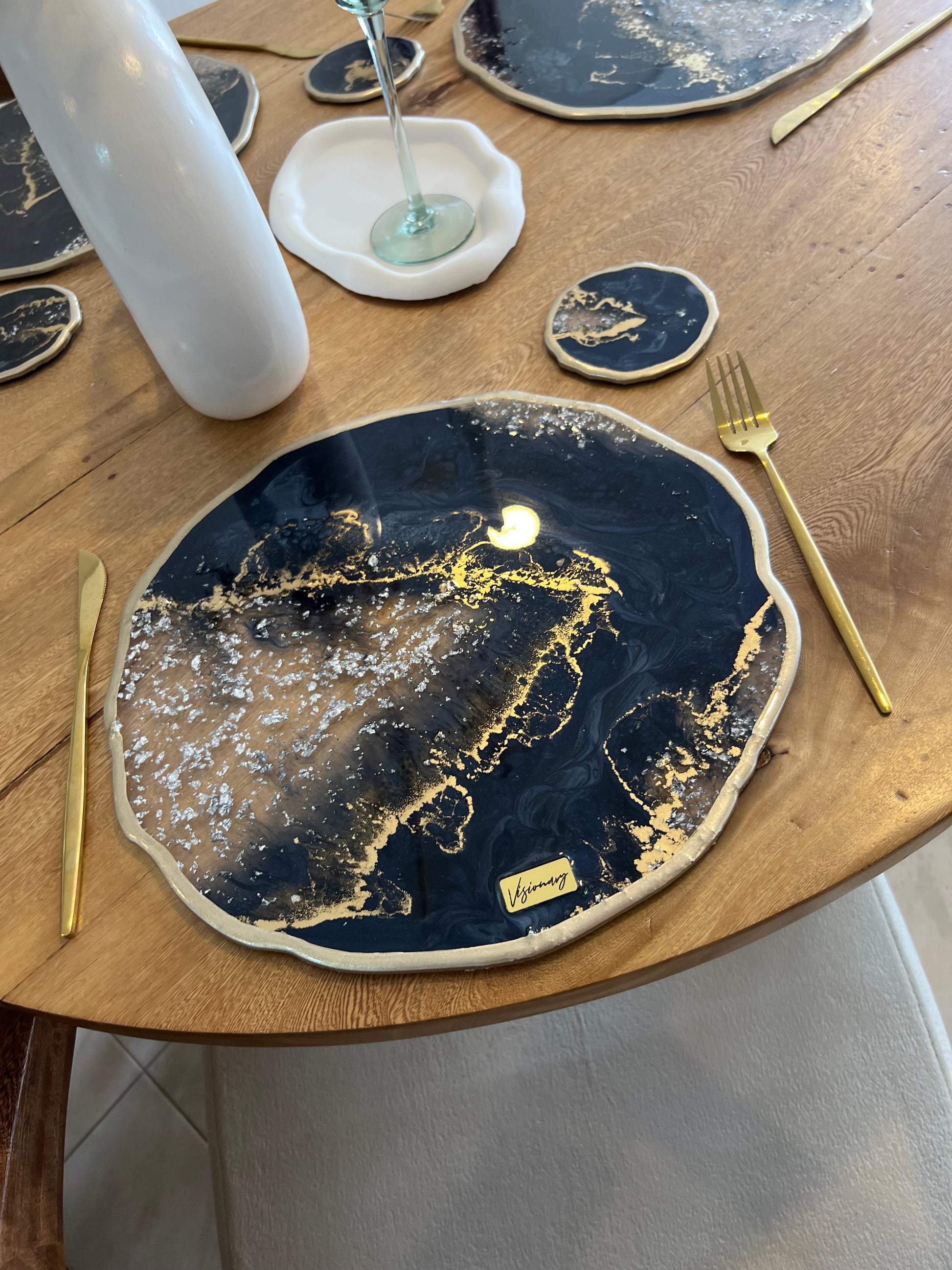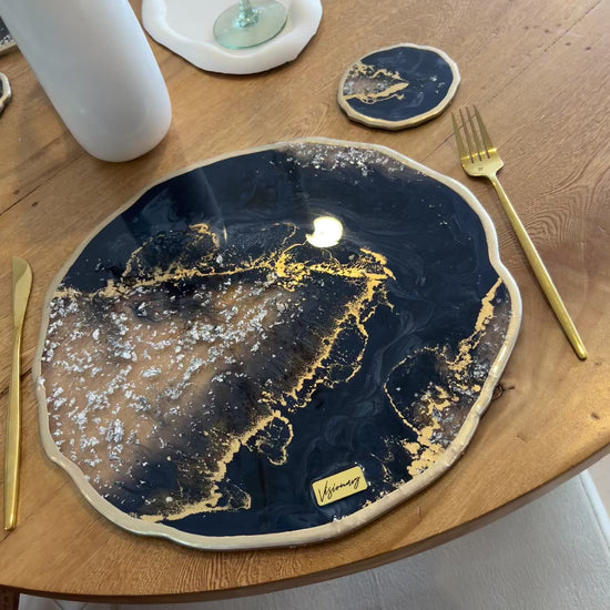 Sumérgete en la elegancia de la noche con Midnight Bloom, un set de individuales y portavasos en resina que combina el misterio del negro profundo con destellos dorados y acentos plateados, evocando una flor que florece bajo la luz de la luna. Cada pieza está trabajada a mano, con bordes orgánicos que aportan un aire artístico y sofisticado a tu mesa. Ideal para cenas especiales o para transformar cualquier ocasión en una experiencia de lujo.