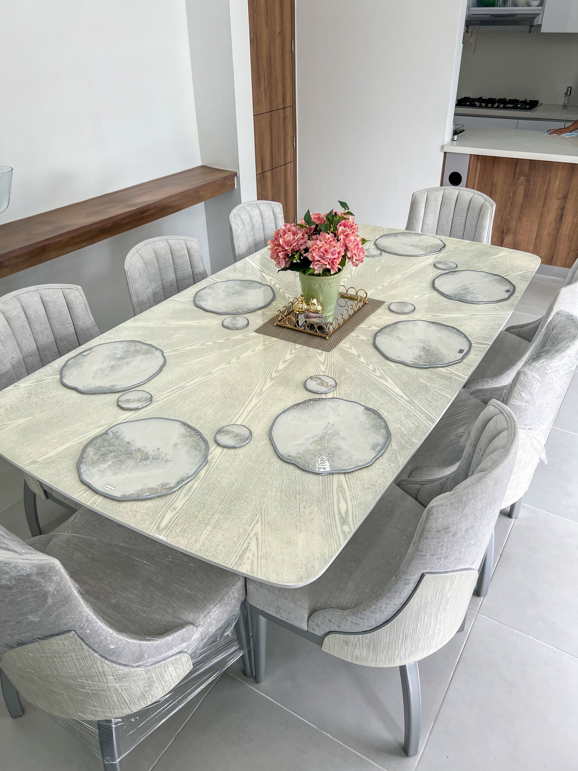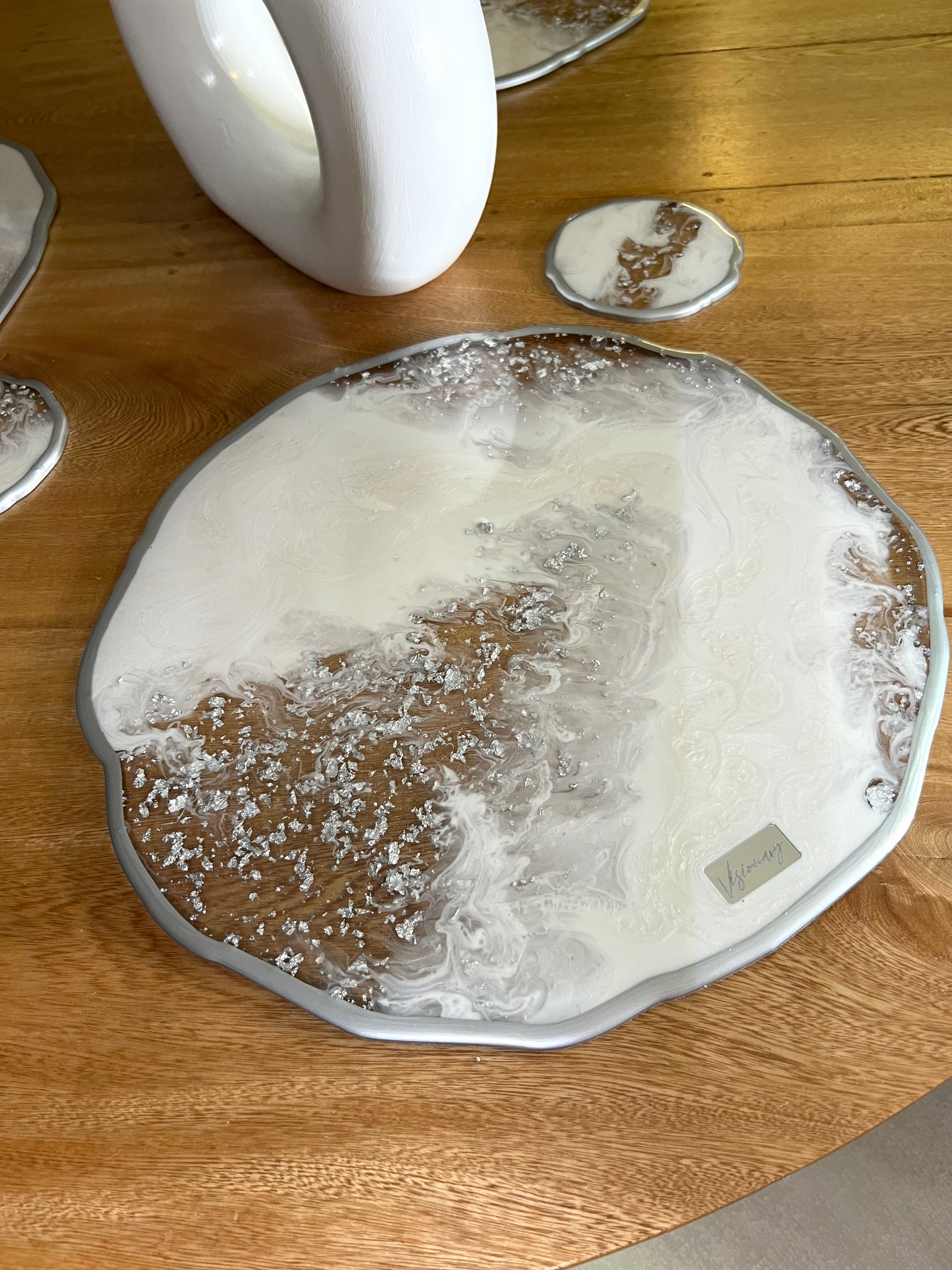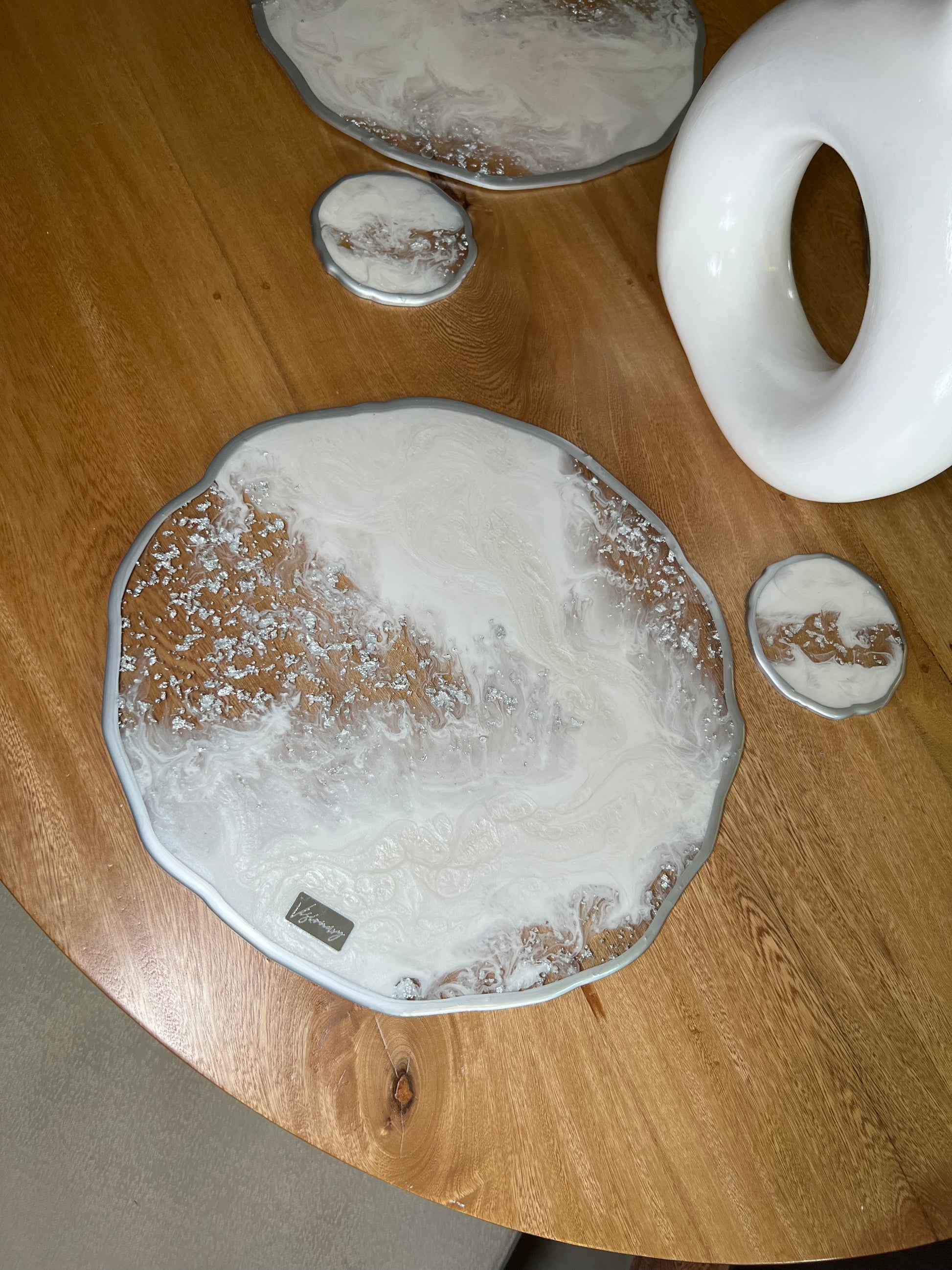 Silver Bloom despliega una fusión etérea de blanco luminoso con acentos plateados, como pétalos de luz sobre una superficie serena. Hecho a mano con dedicación y detalle, este set transforma cualquier espacio en un rincón de sofisticación sutil y encanto atemporal.