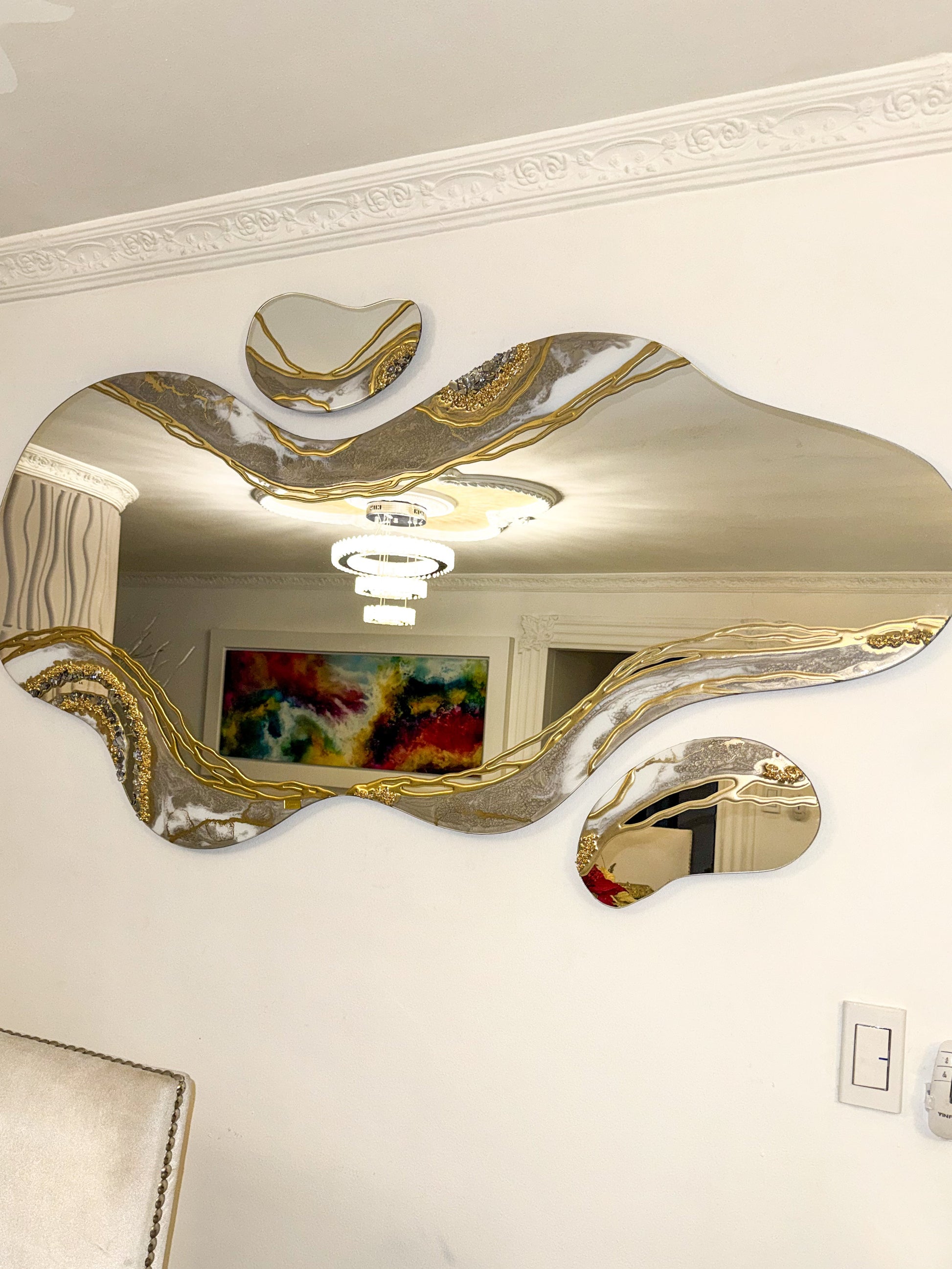 El espejo Aura Imperial Grey es una obra decorativa elaborada a mano en resina premium, inspirada en las vetas naturales del mármol y las formaciones minerales de tonos grises elegantes. Su silueta orgánica aporta movimiento y modernidad, convirtiéndose en una pieza protagonista dentro de cualquier espacio.