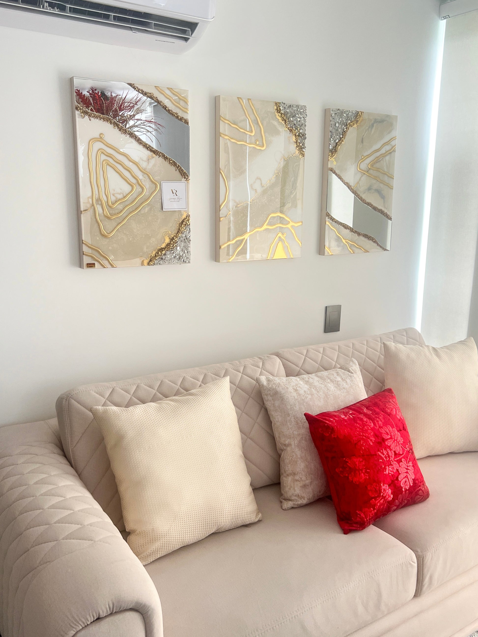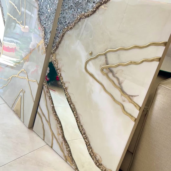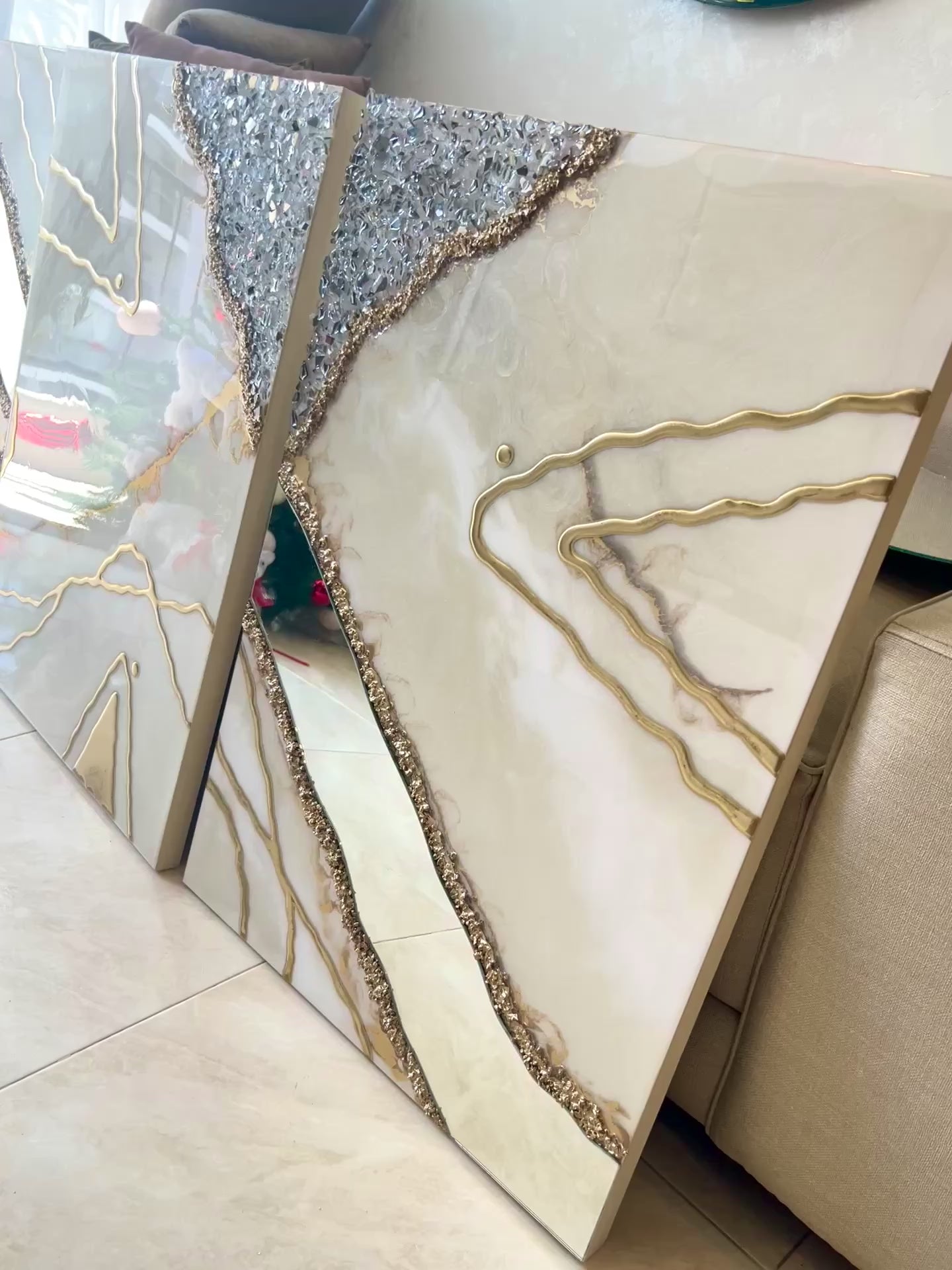 Los detalles cristalinos integrados en la obra reflejan la luz de forma sutil, generando una sensación de movimiento y textura que transforma cualquier espacio en un ambiente moderno y refinado. Cada pieza es única, con patrones irrepetibles que reflejan la esencia artesanal de Visiónary Resin.