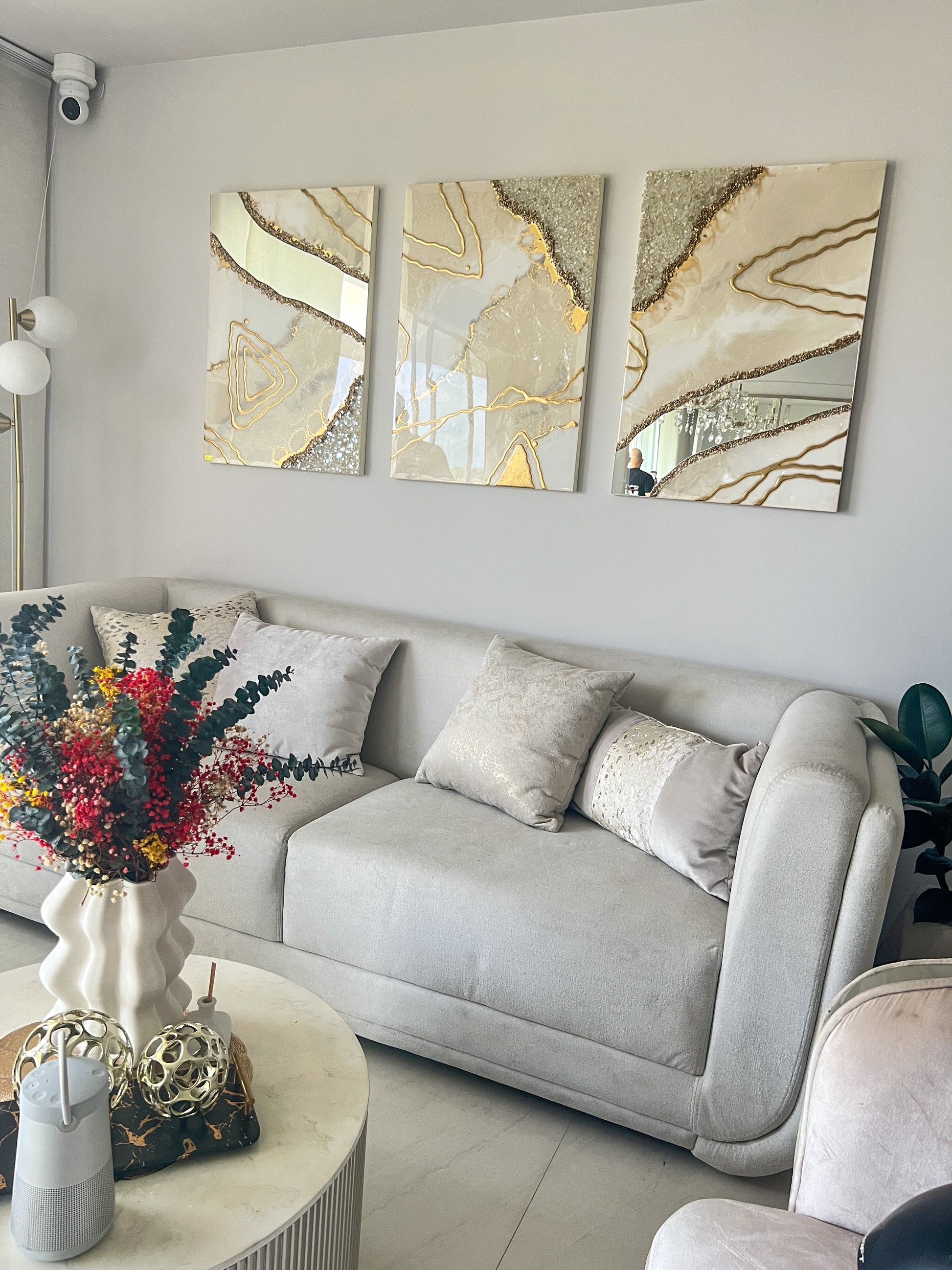 Imperial Grey Essence es una composición artística elaborada a mano en resina premium, inspirada en la elegancia natural del mármol y las formaciones minerales tipo geoda. Sus tonos grises suaves combinados con blancos cremosos crean una base sofisticada que se realza con delicadas vetas doradas metálicas, aportando profundidad, brillo y un acabado de alto lujo.
