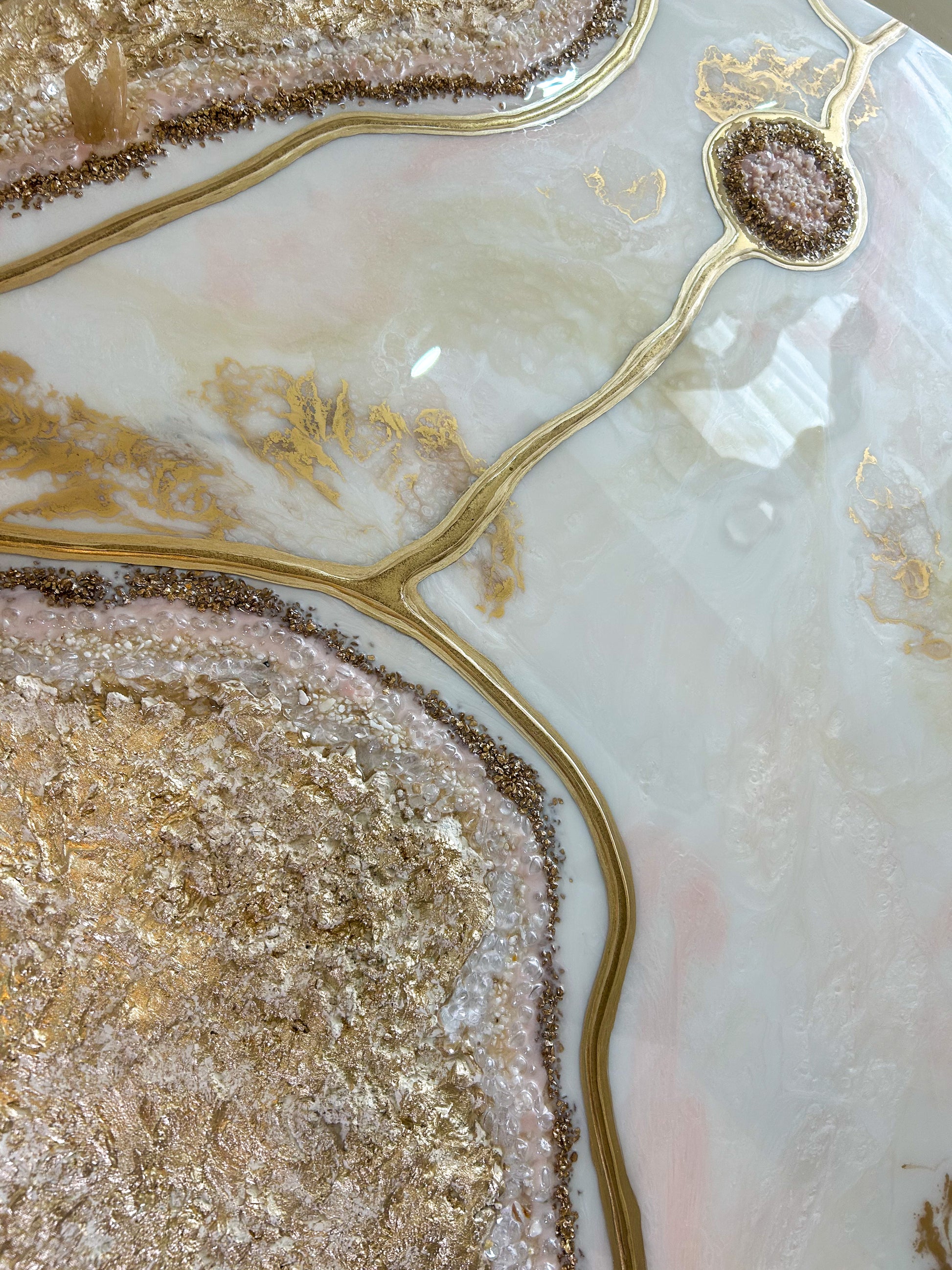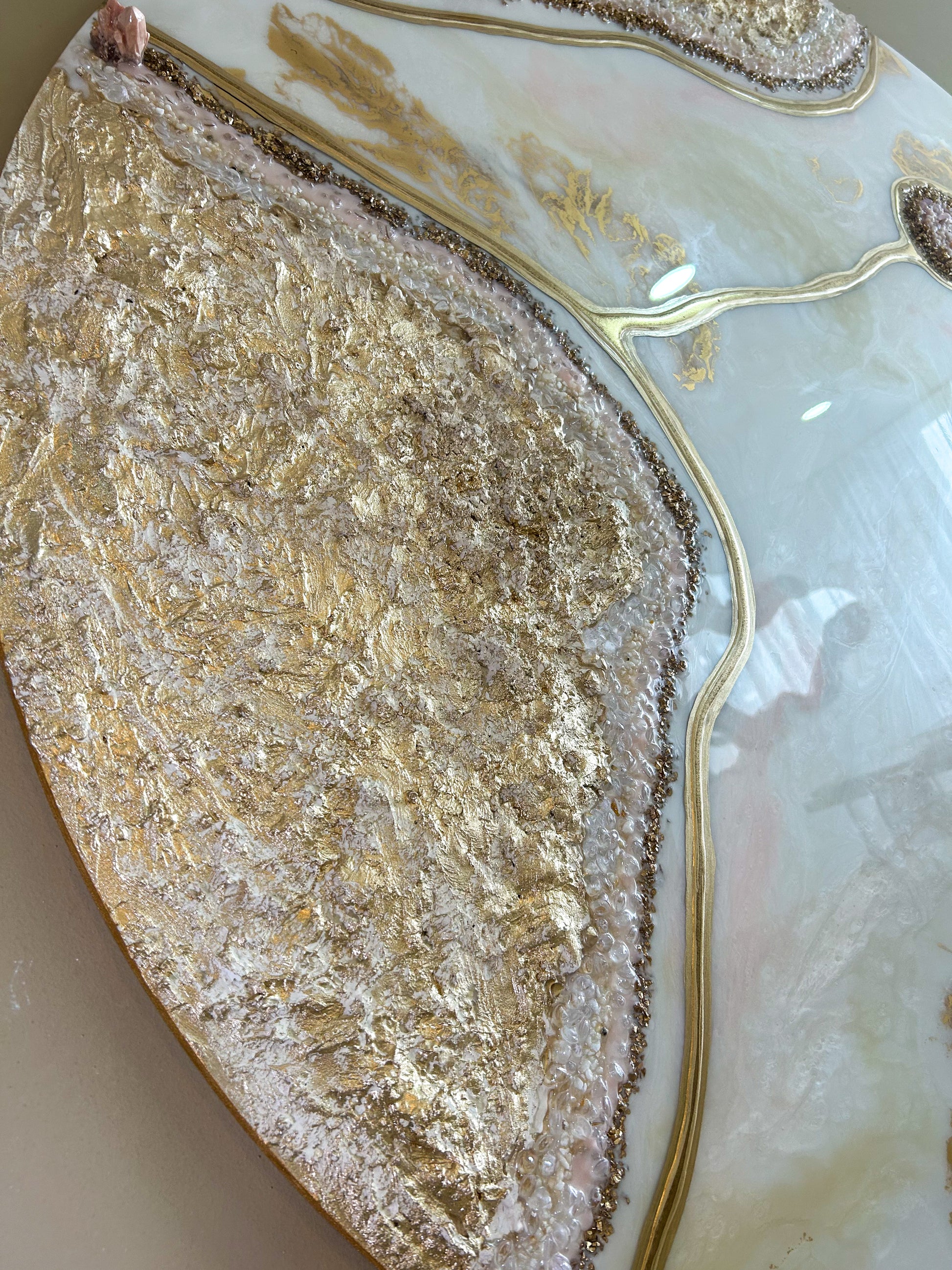 Adéntrate en la sofisticación y el misterio de Velvet Geoda, una obra de arte que fusiona la elegancia sutil con la fuerza de un diseño contemporáneo. Esta pieza se presenta en un delicado tono blanco perla, enriquecido con matices de rosado y beige, y acentos en dorado que realzan su luminosidad y distinción.