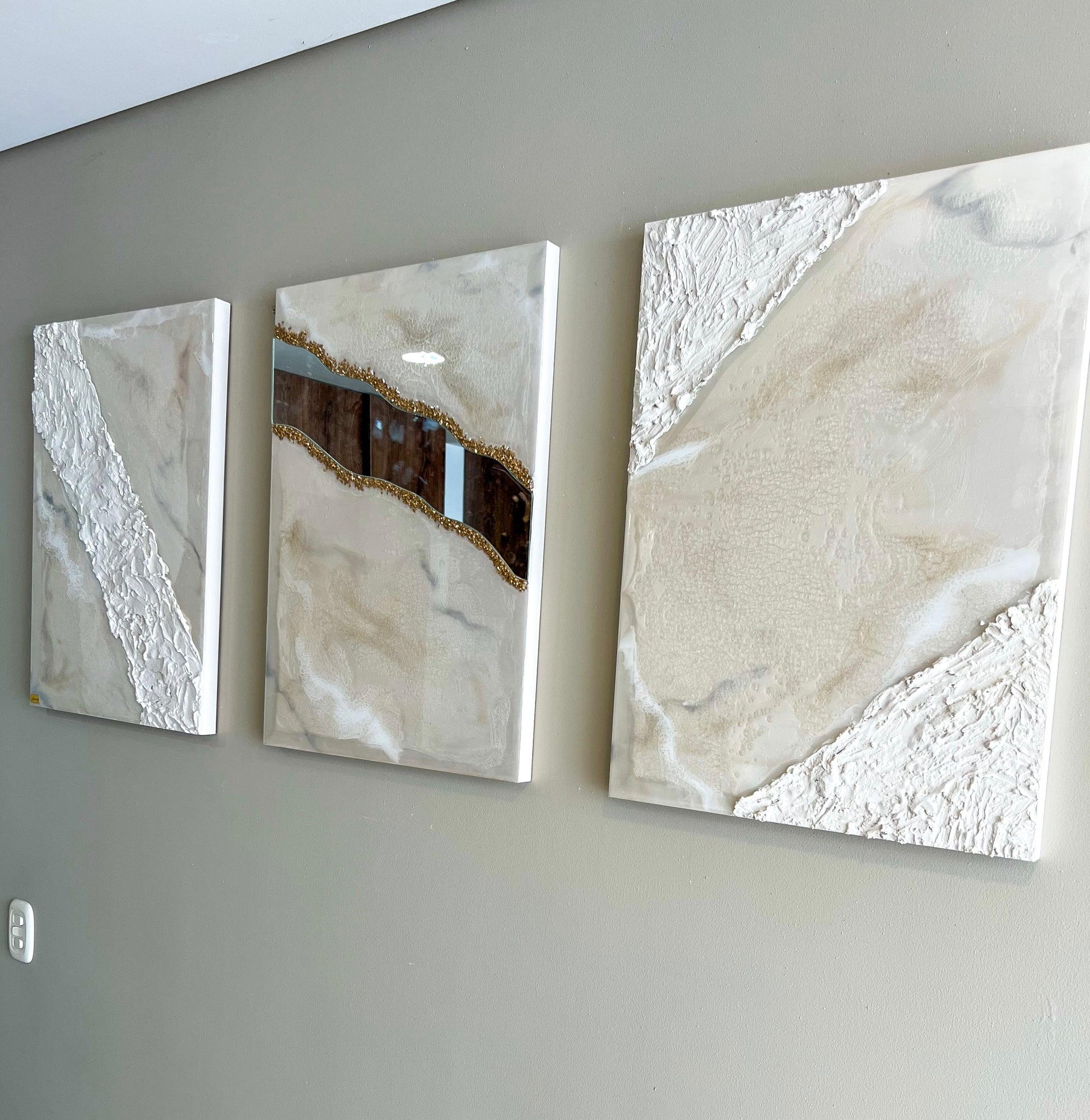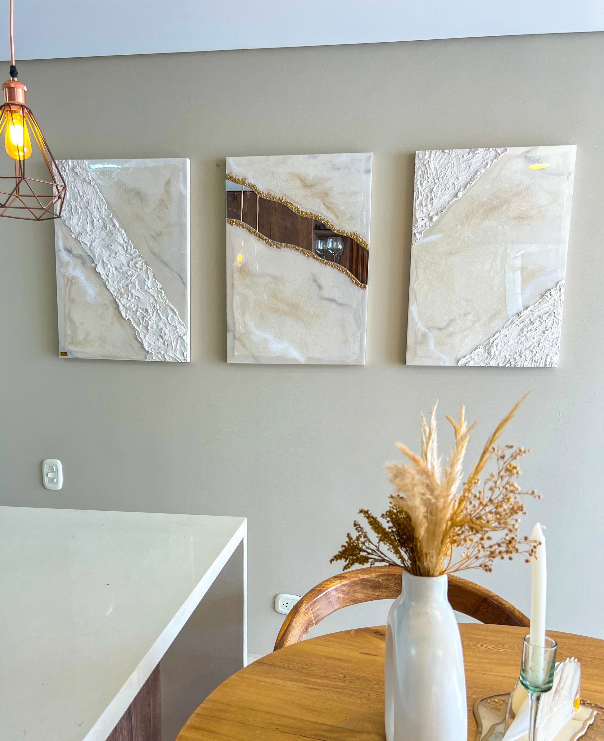 Una composición que evoca la pureza y la calma del paisaje más sereno. White Silence combina tonos marfil, texturas orgánicas y destellos dorados para crear una atmósfera de quietud y sofisticación. Un tríptico que invita a la contemplación y aporta luz sutil y elegancia atemporal a cualquier espacio.